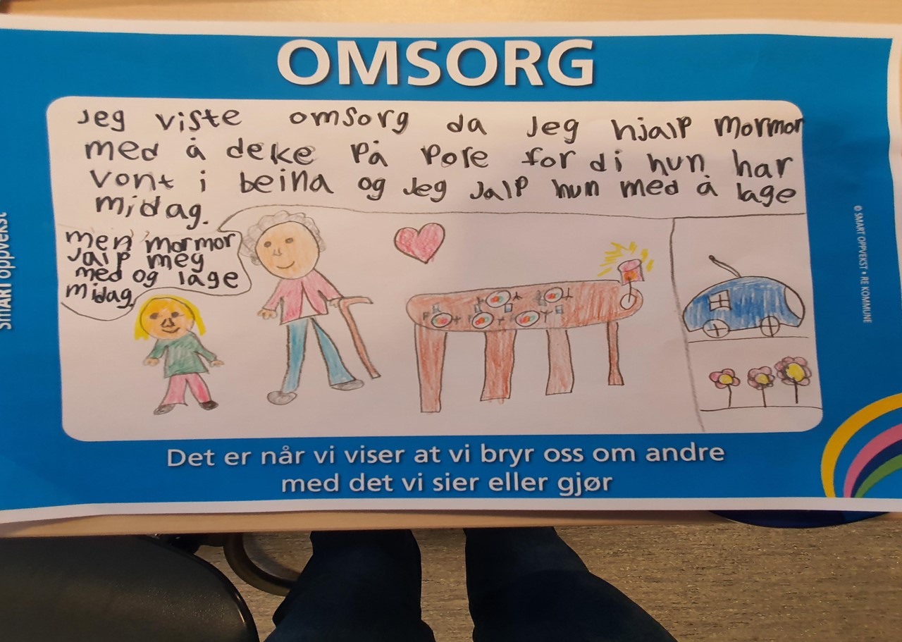 Etter en god prat rundt omsorg fikk elevene i oppgave i å tegne fra en gang de ga eller fikk denne egenskapen. Her kom det mange fine bilder fra elevene. Noen valgte kun å skrive og det var også greit.